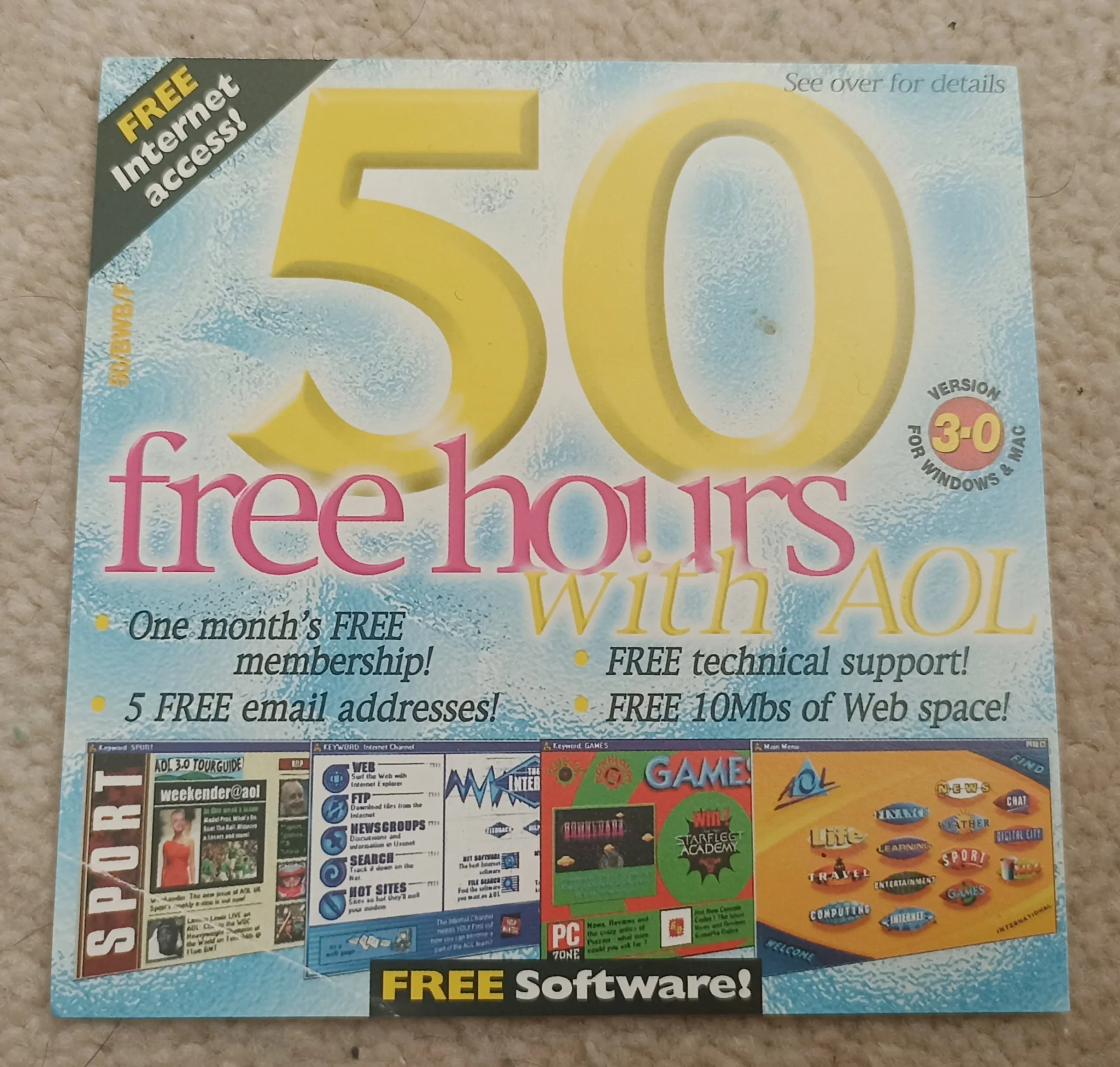 The CDs were pretty much distributed everywhere. Through the mail, attached to magazines, given out by people at train stations etc. The marketing strategy was referred to as “carpet bombing”. You’d soon have so many lying around that they’d be used for other purposes, for example, as a bookmark or a coaster.